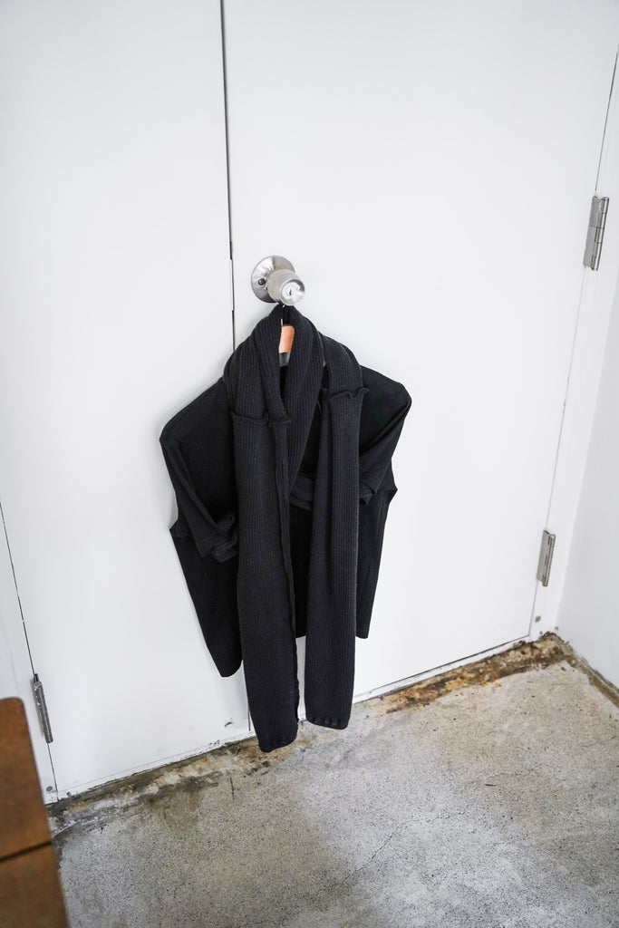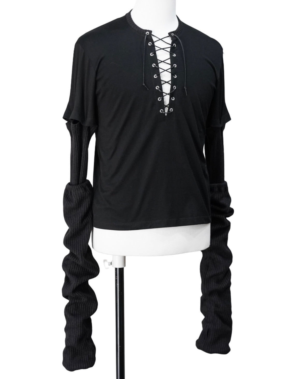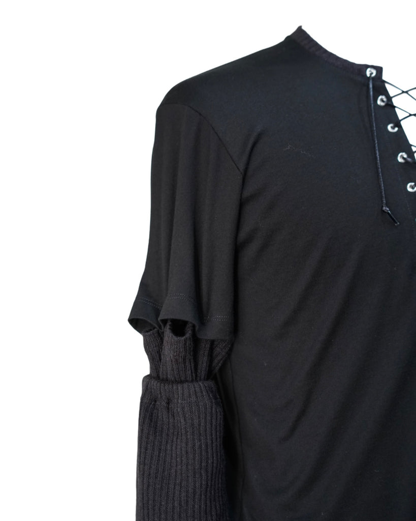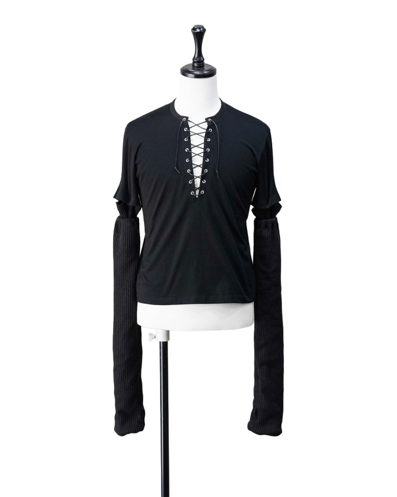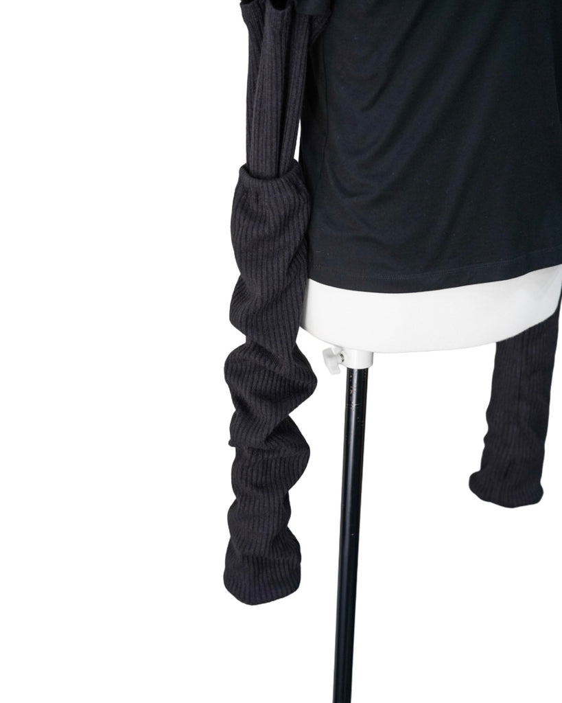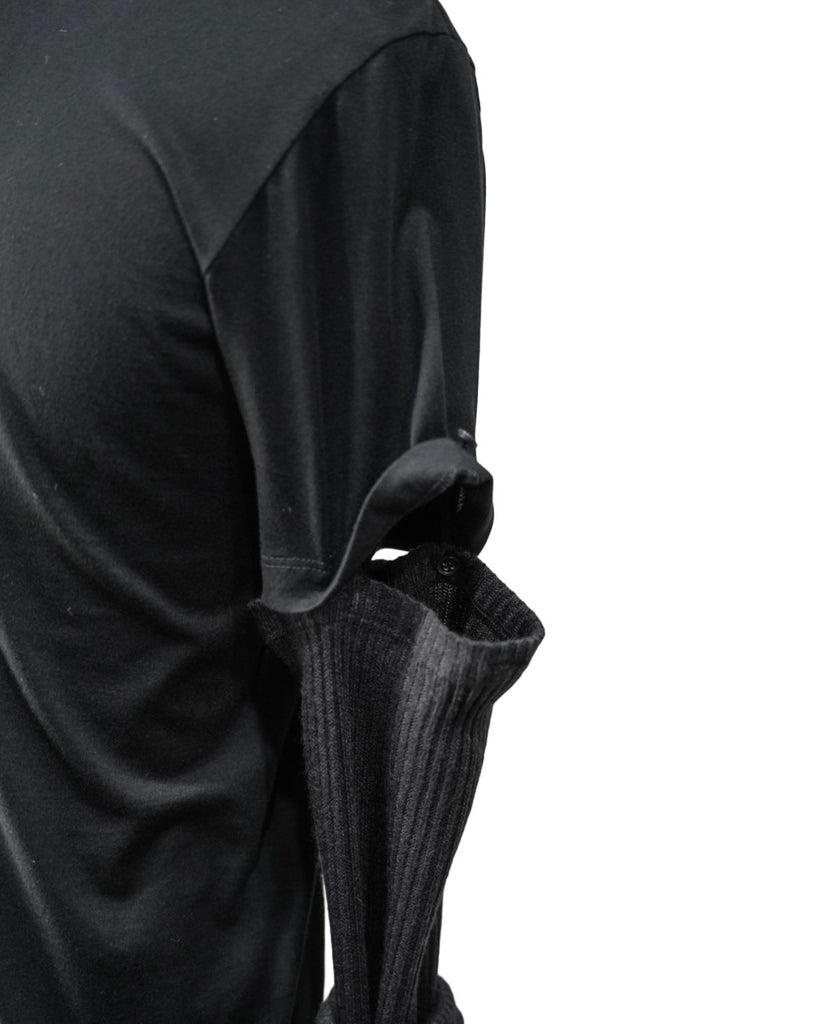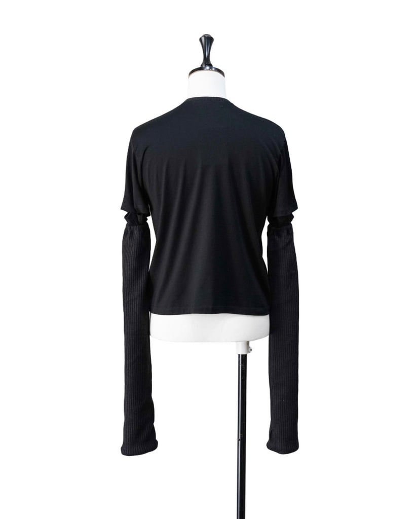 袖部分は異素材のリブスリーブで、レイヤードしたような構築的シルエットを実現。着脱も可能です。