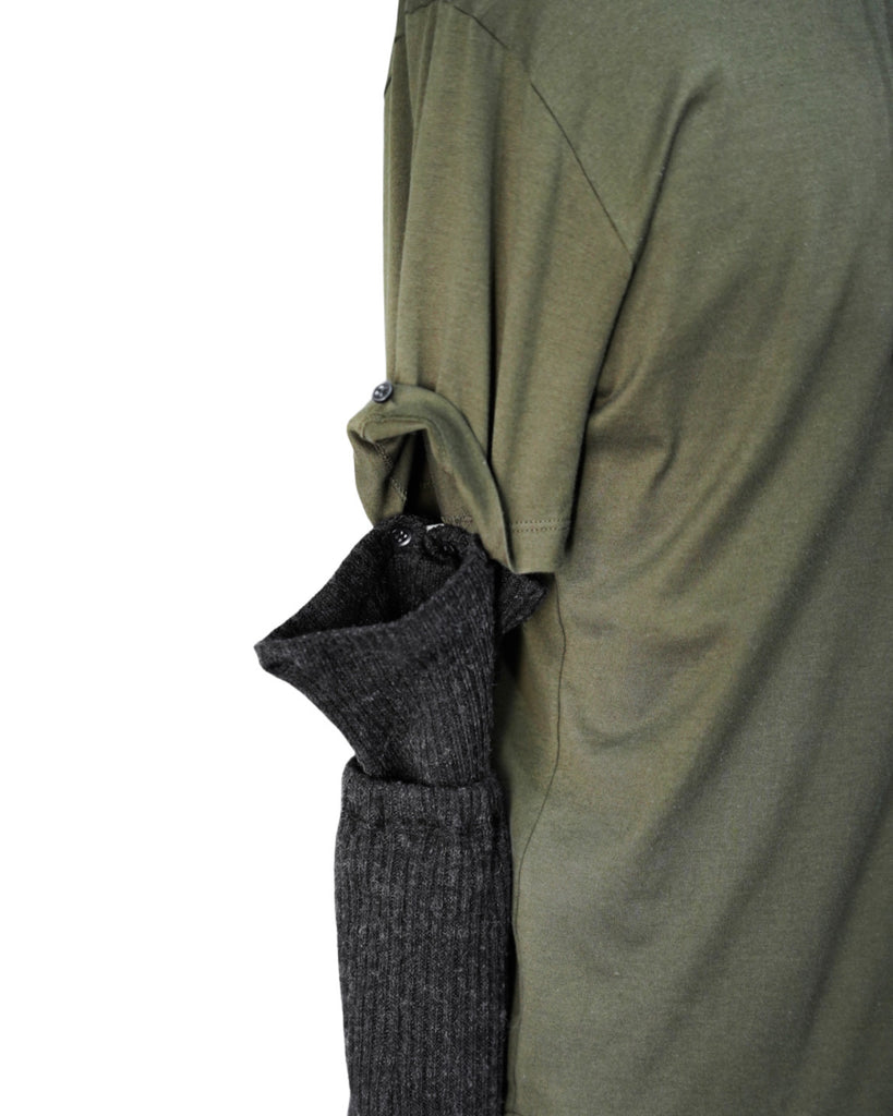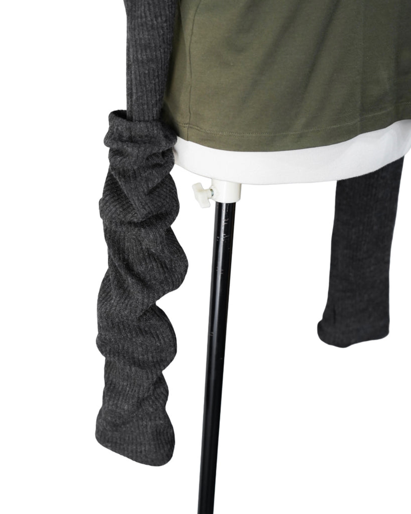 袖部分は異素材のリブスリーブで、レイヤードしたような構築的シルエットを実現。着脱も可能です。